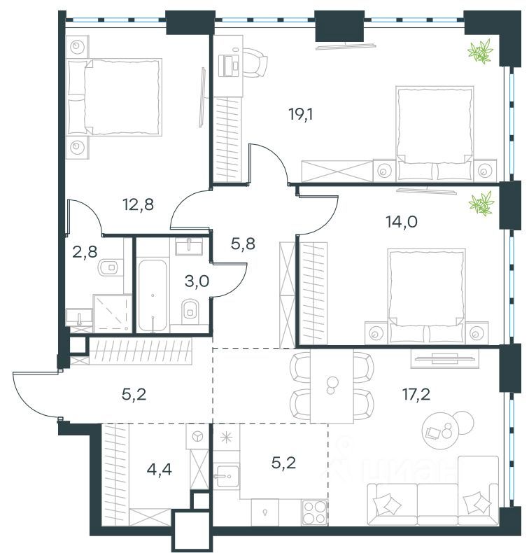 - 3 комнаты
